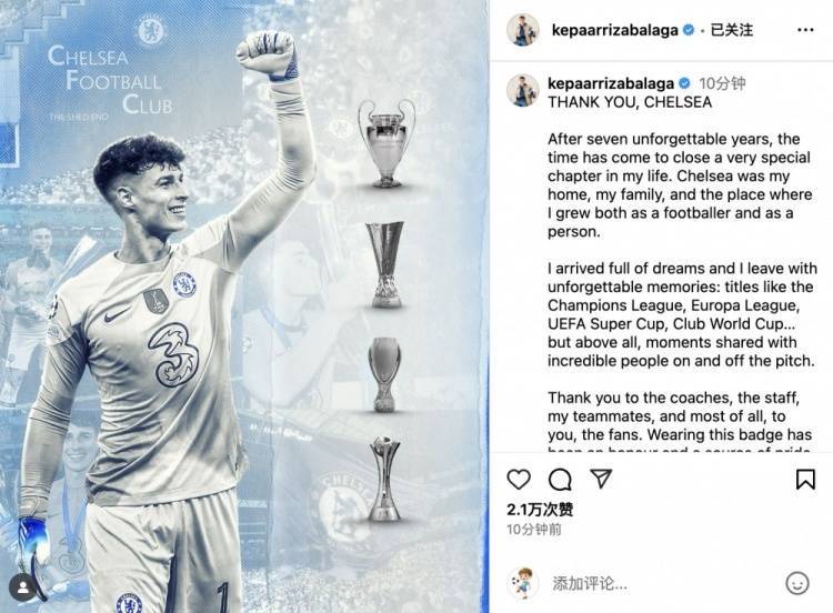 直播吧7月1日讯 凯帕已接受体检,即将加盟阿森纳。这位西班牙门将更新社交媒体发长文向切尔西深情告别。